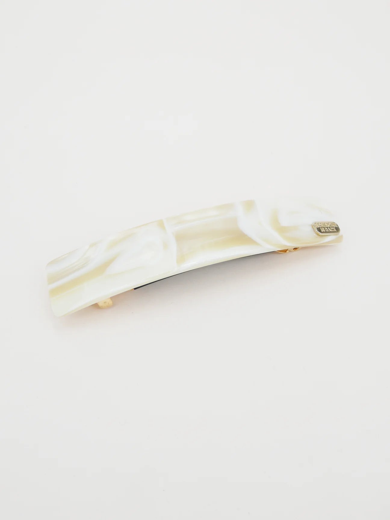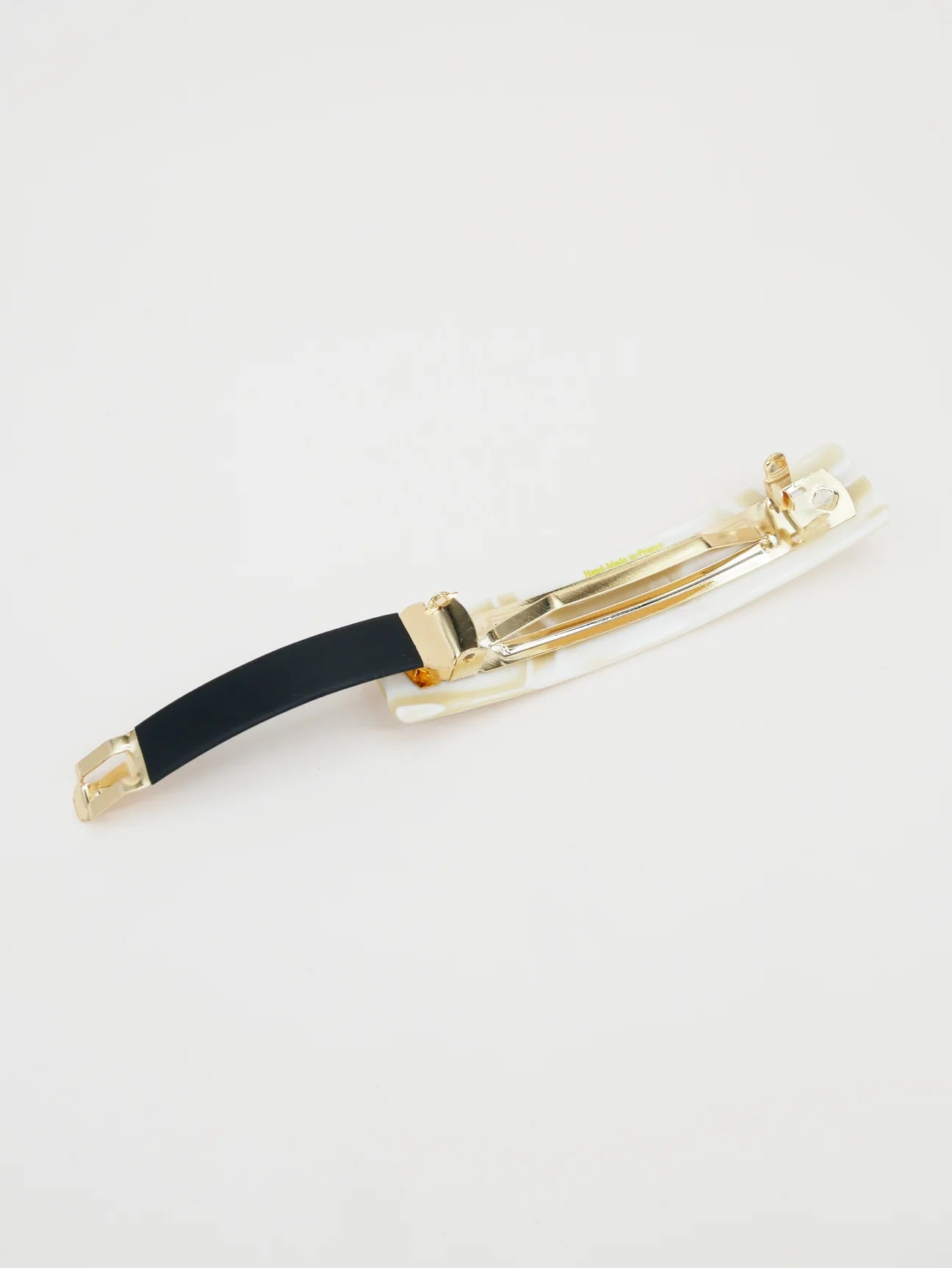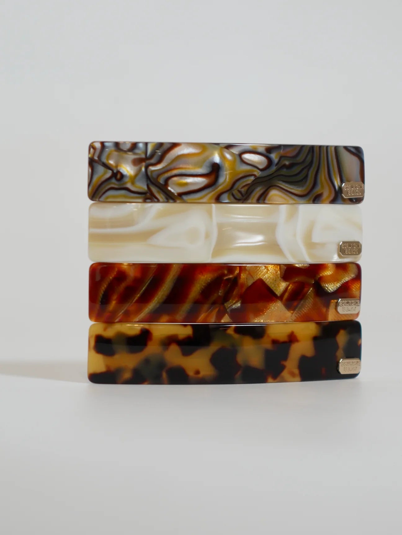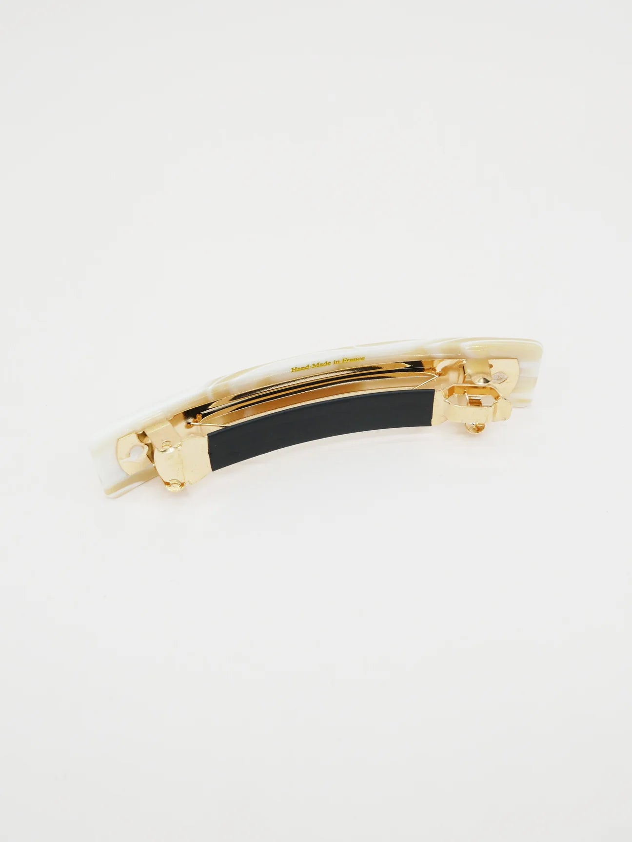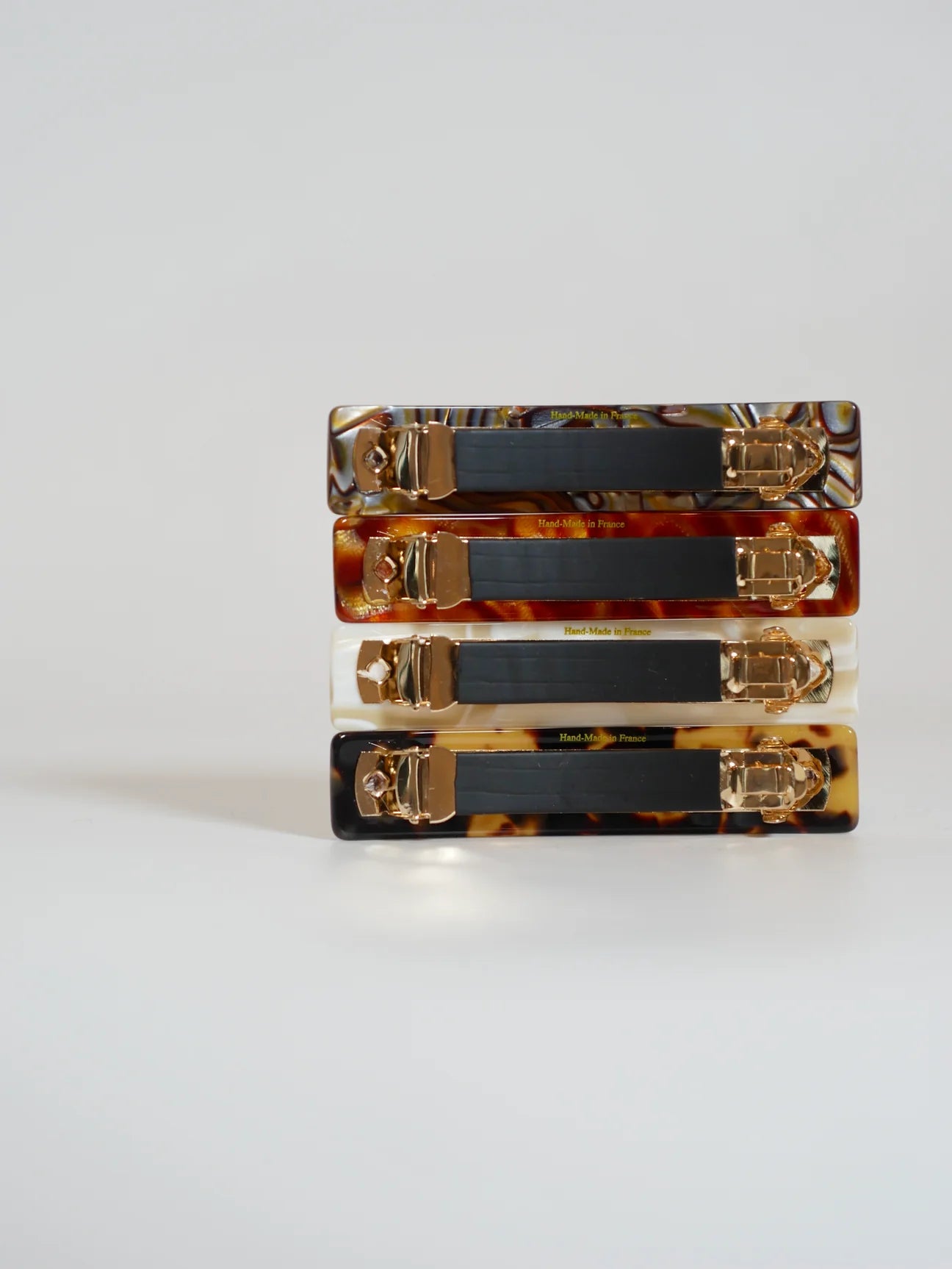 • BARRETTE en acétate de cellulose de haute qualité, un matériau noble reconnu pour sa légèreté, sa résistance et sa brillance naturelle. Sa base dorée est équipé d’une bande en caoutchouc antiglisse, assurant un maintien optimal sans abîmer la fibre capillaire. Fabriquée en France dans les ateliers d’Oyonnax.