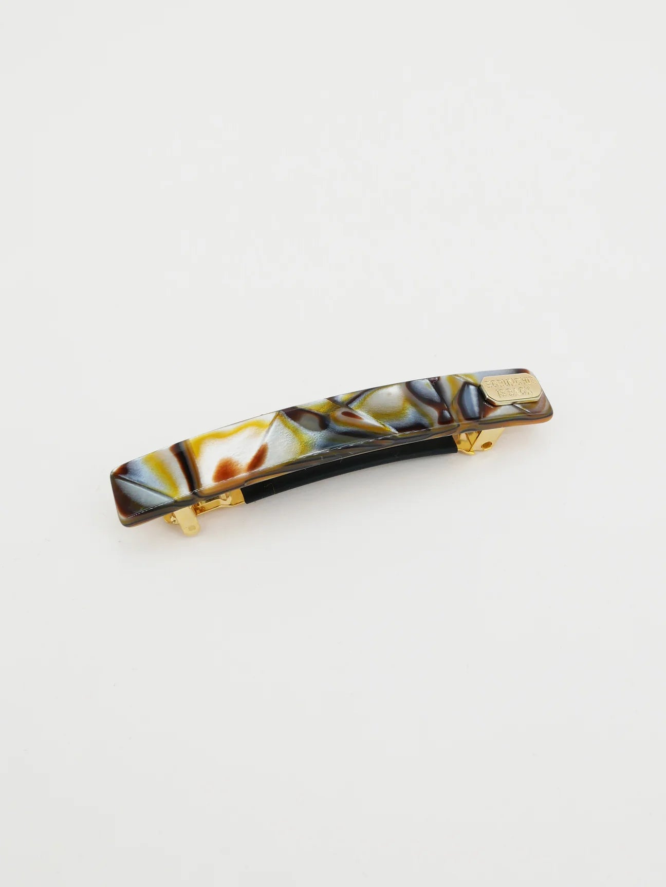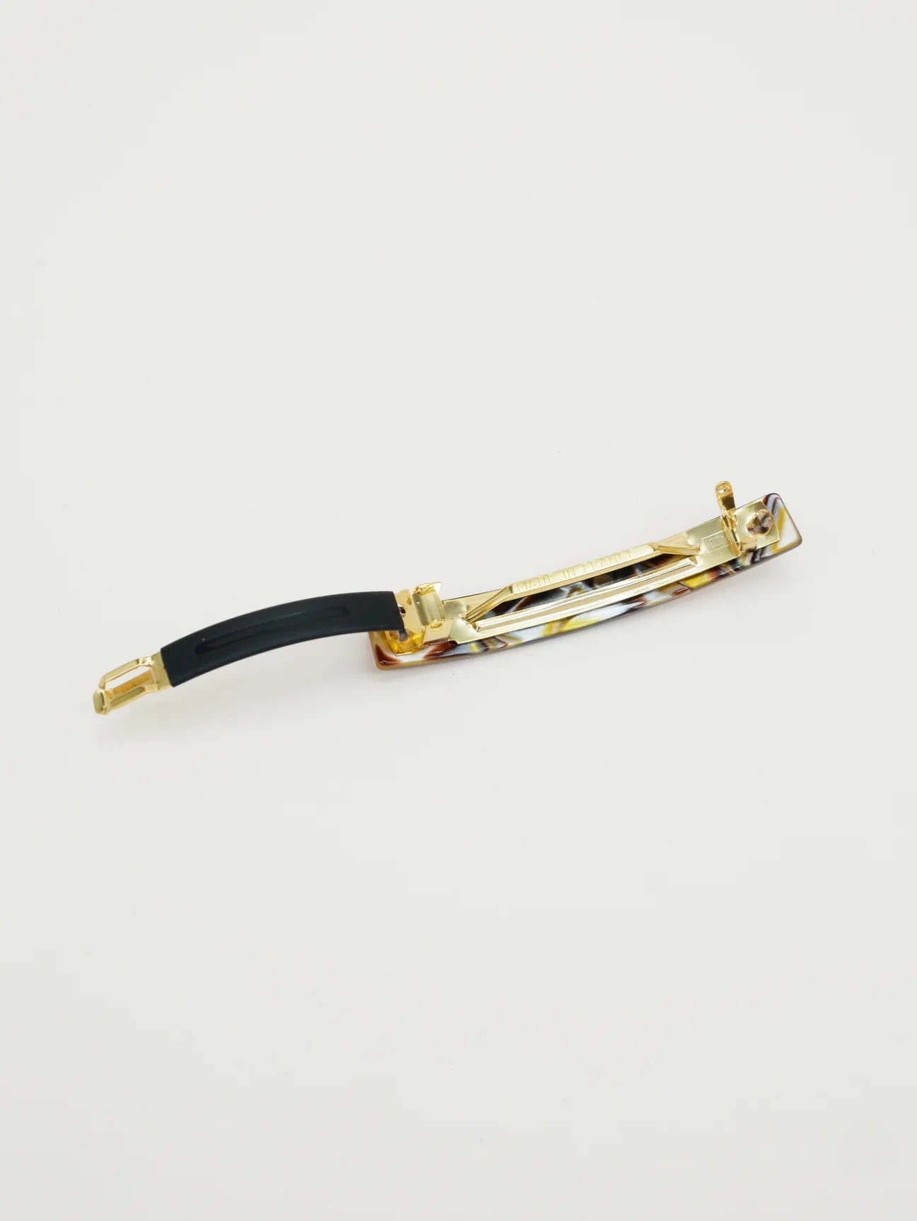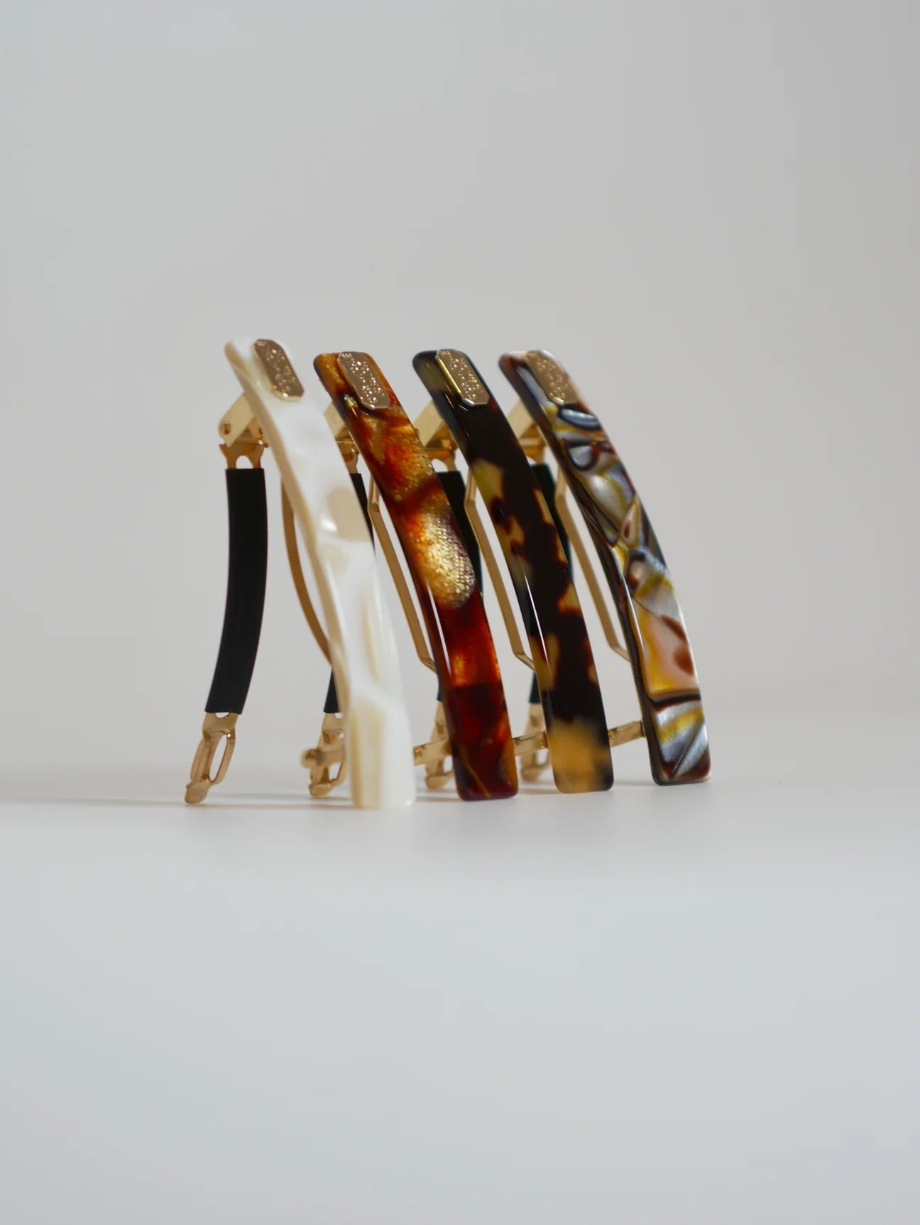 BARRETTE en acétate de cellulose de haute qualité, un matériau noble reconnu pour sa légèreté, sa résistance et sa brillance naturelle. Sa base dorée est équipé d’une bande en caoutchouc antiglisse, assurant un maintien optimal sans abîmer la fibre capillaire. Fabriquée en France dans les ateliers d’Oyonnax.