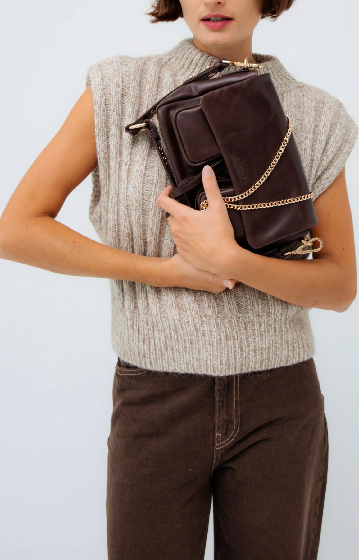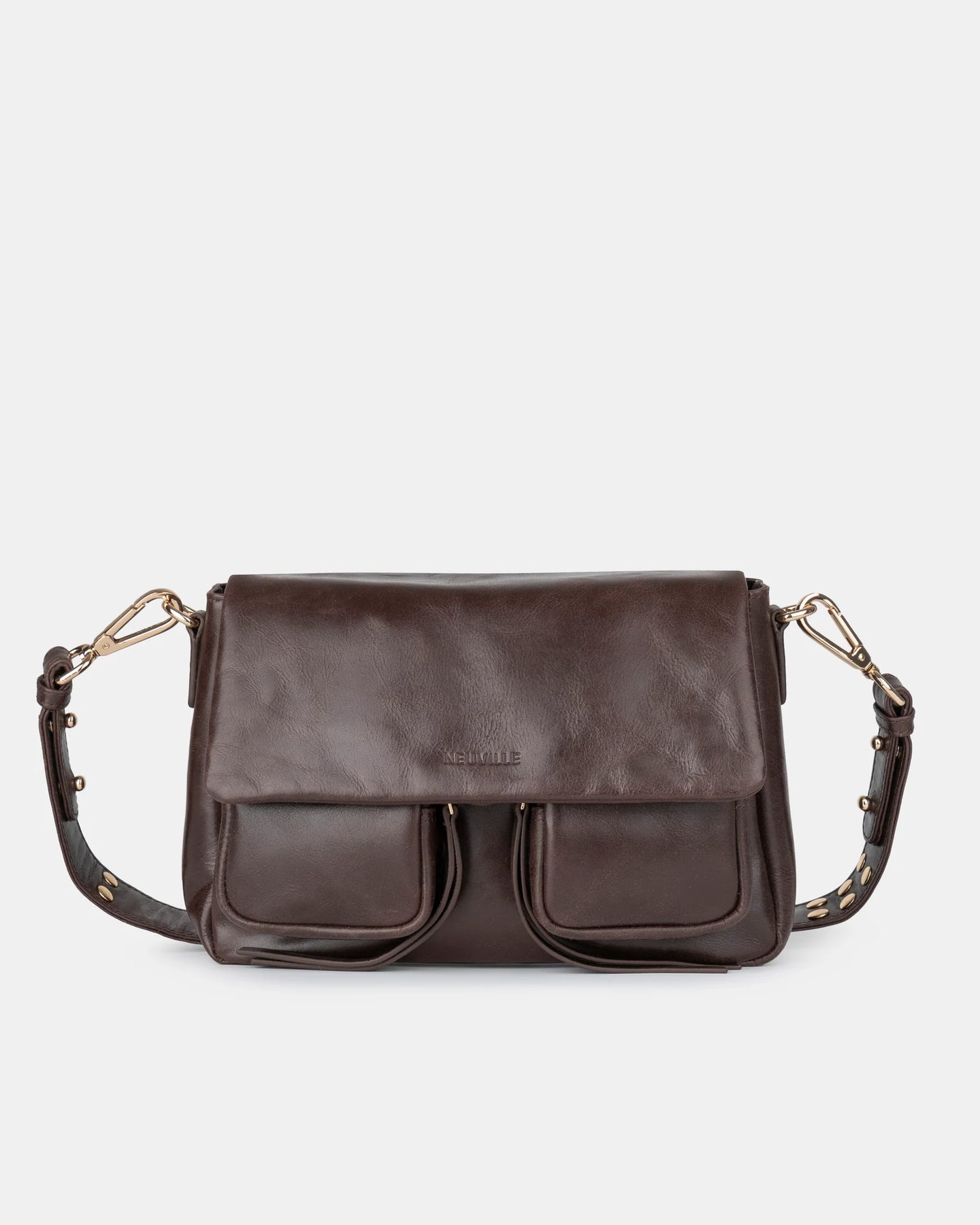 Sac Neuville Maxke Chocolate Gold , avec détails dorés. Intérieur divisé en deux compartiments par une poche centrale zippée, deux poches carrées zippées à l’extérieur, fermeture à rabat magnétique. Deux anses fournies avec le sac : anse en cuir clouté pour un porté épaule et une bandoulière en cuir réglable. Il possède également une chaînette dorée amovible.