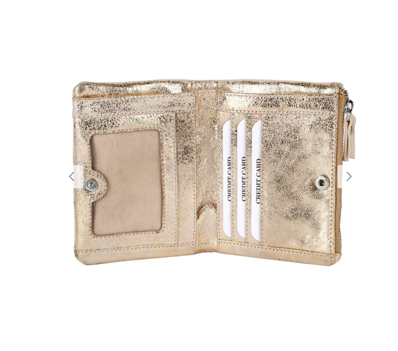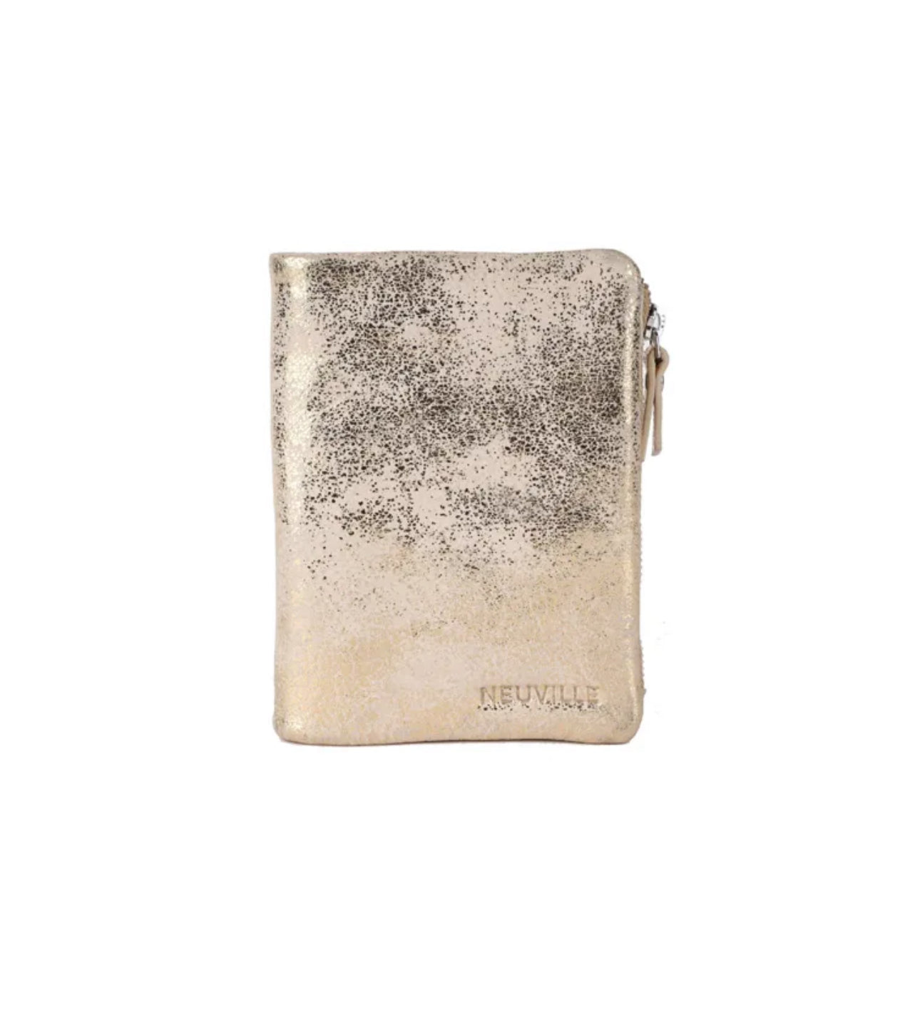 Petit portefeuille Everything de NEUVILLE SUNSET Gold, fermeture bouton-pression, pochette zippée sur le côté pour les pièces de monnaie, fentes pour cartes.