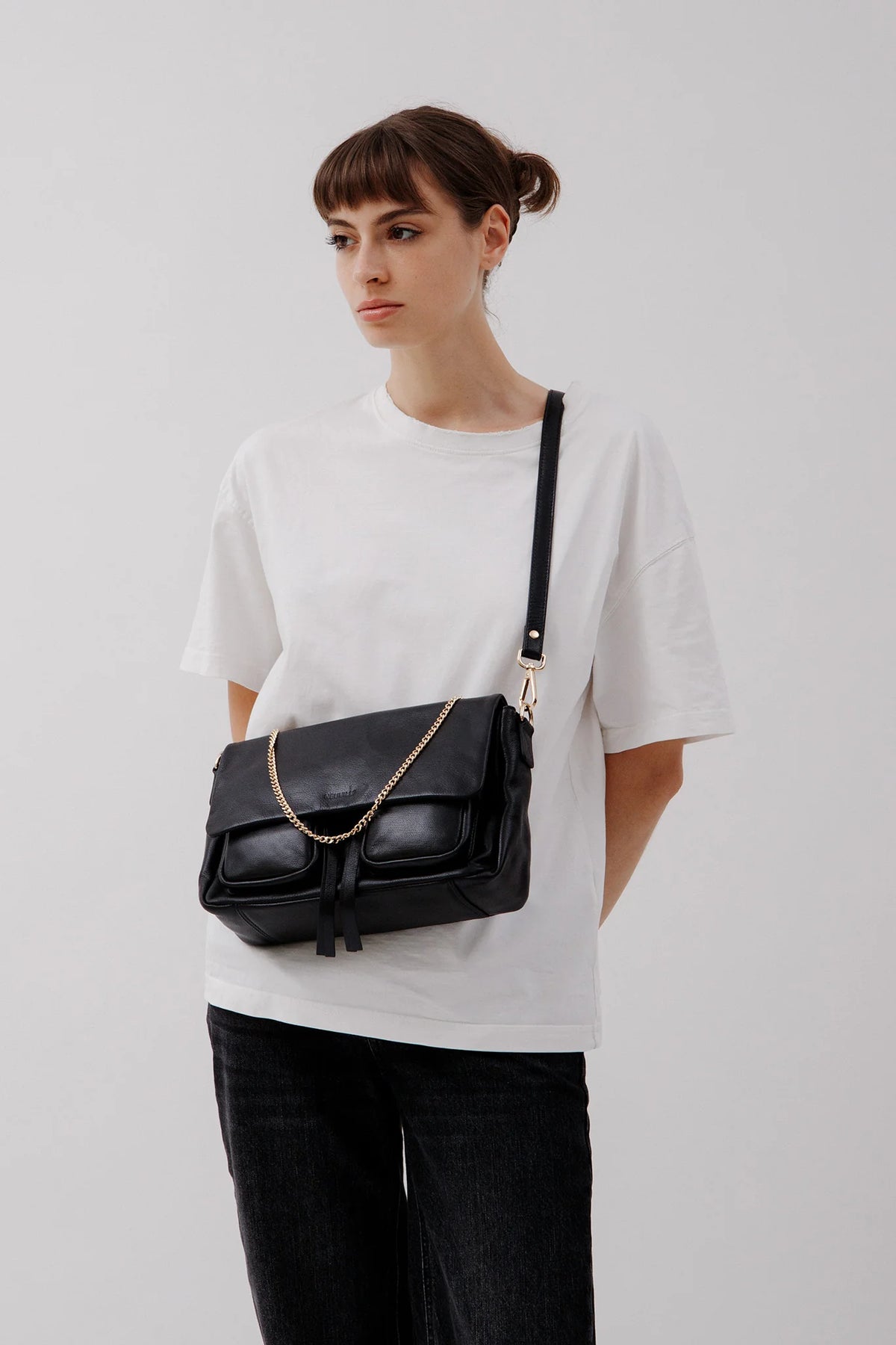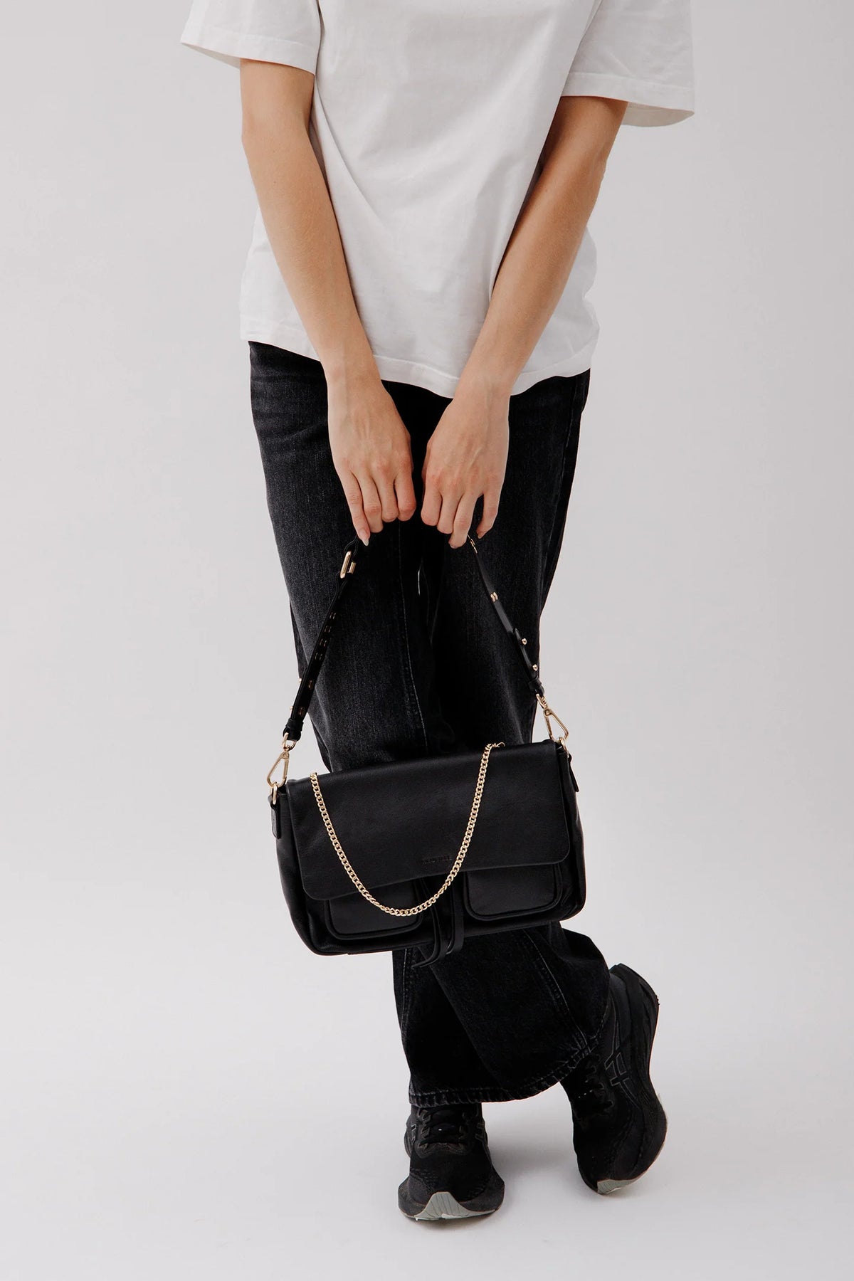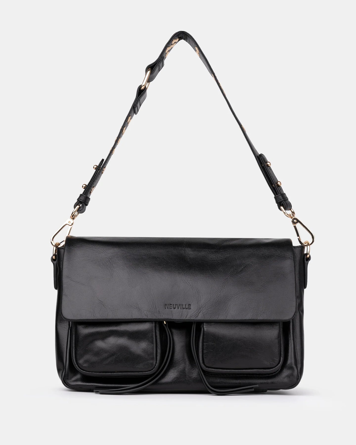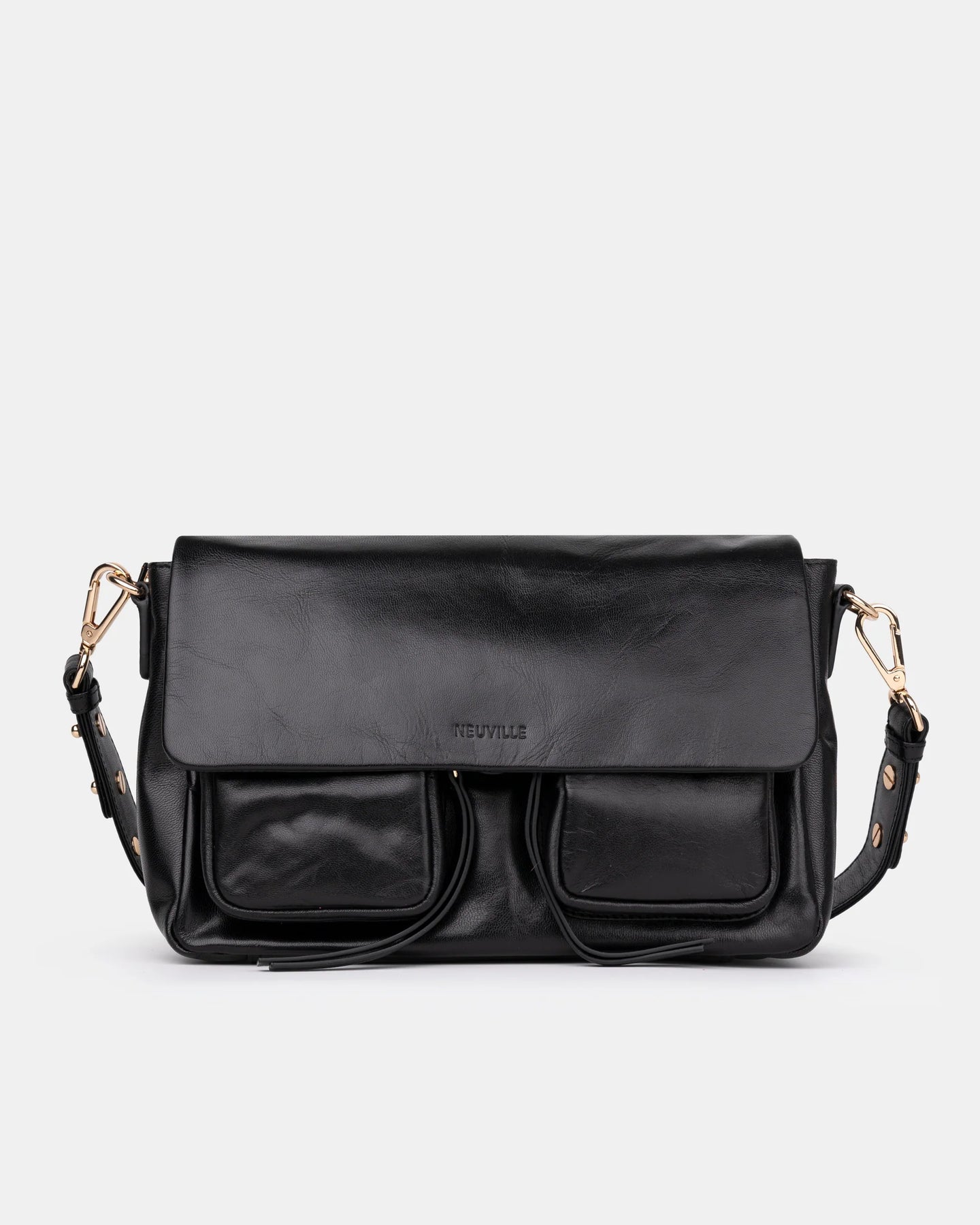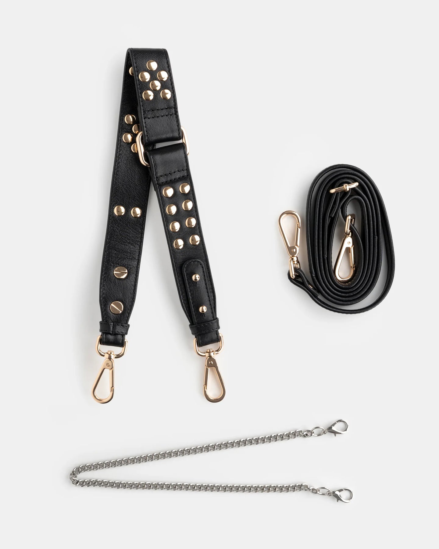 • Sac Max de NEUVILLE Black Gold, trois sangles interchangeables pour faciliter les transitions : une bandoulière en cuir avec clous métalliques, une sangle transversale réglable en cuir et une chaîne décorative en métal.