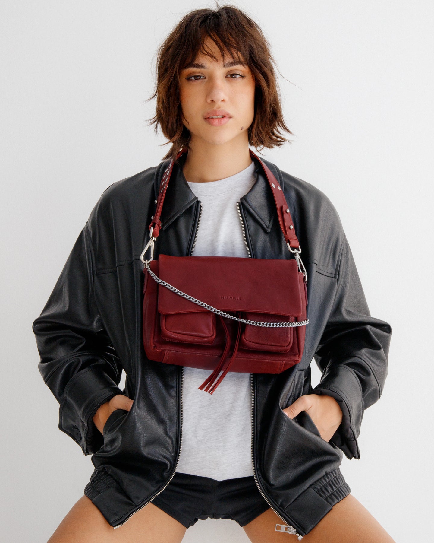 Sac Neuville Maxke Burgundy , avec détails argentés . Intérieur divisé en deux compartiments par une poche centrale zippée, deux poches carrées zippées à l’extérieur, fermeture à rabat magnétique. Deux anses fournies avec le sac : anse en cuir clouté pour un porté épaule et une bandoulière en cuir réglable. Il possède également une chaînette dorée amovible.