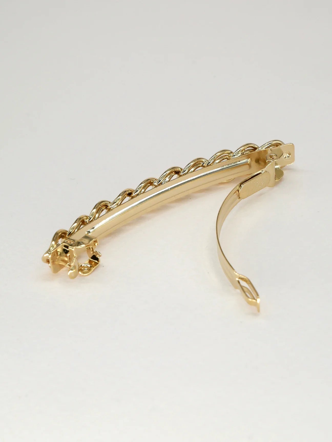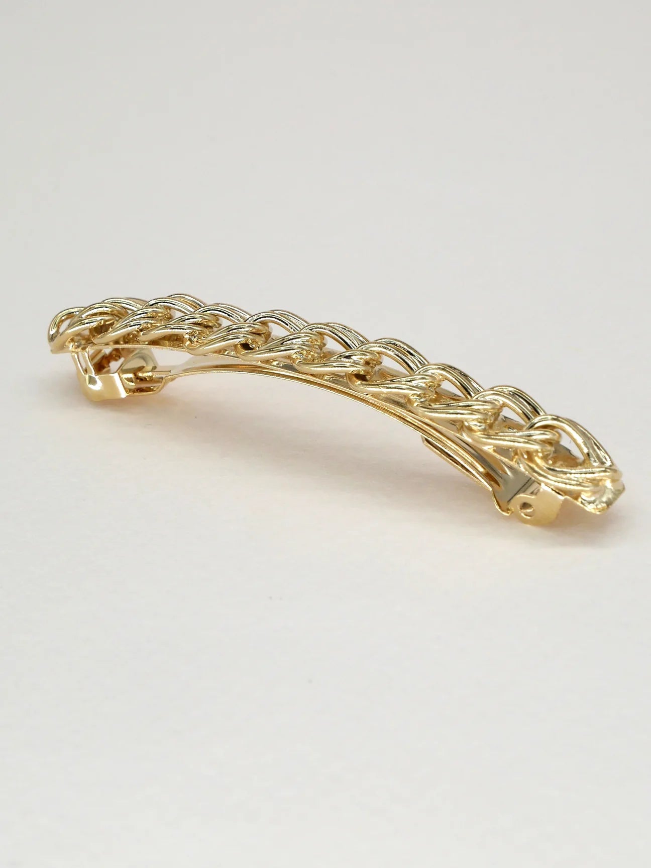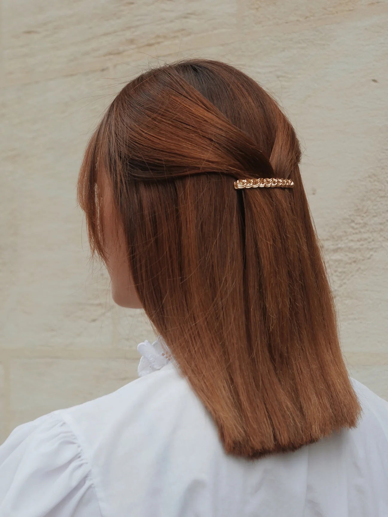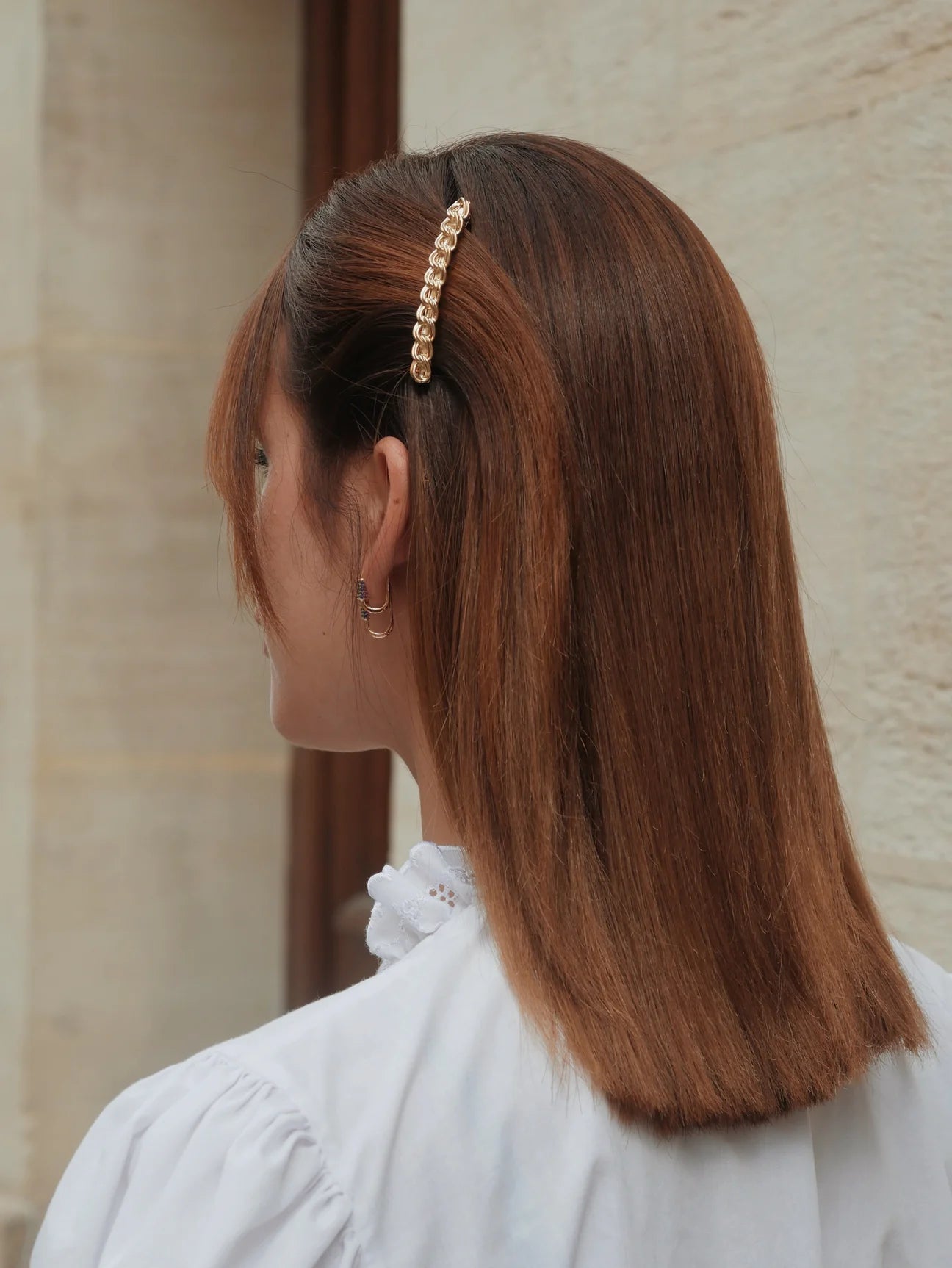 BARRETTE en forme de chaîne, elle mesure 6 cm de long. On peut l’attacher en demi-queue ou pour maintenir une mèche sur le côté. Elle est fabriquée à la main dans un atelier près de Florence, dans le nord de l'Italie.
