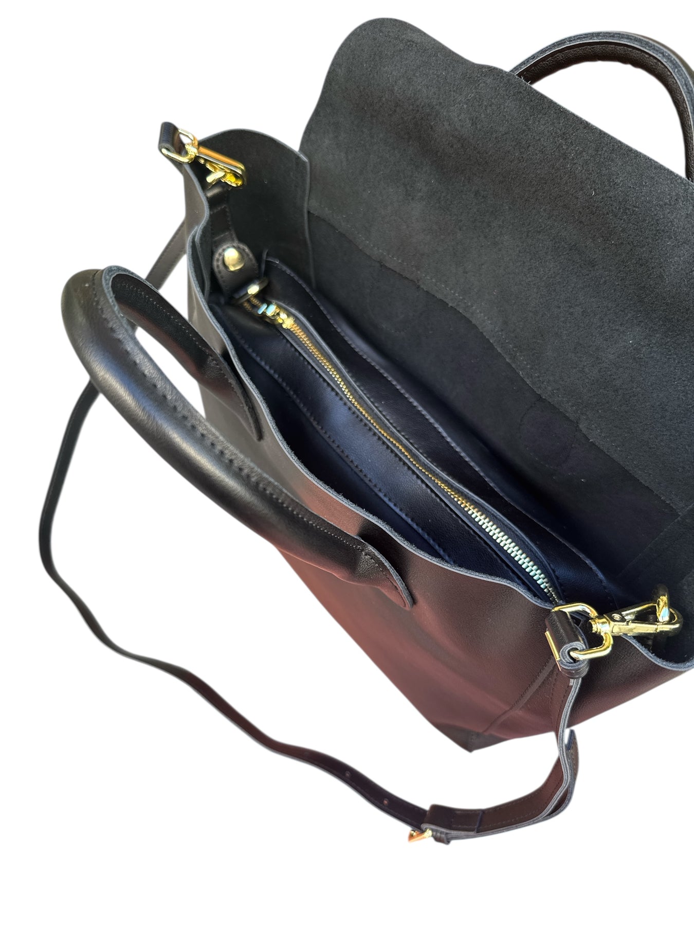 Sac TELMA noir , fermeture par un rabat, anse main + anse bandoulière amovible, housse zippée détachable par pressions.